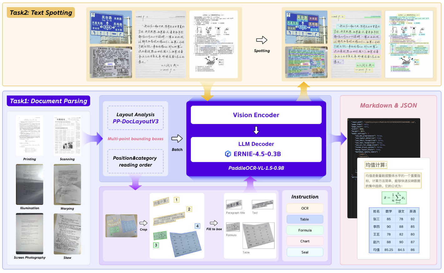 文档解析远不止“把字读出来”:真正难点是读懂复杂版面——表格要保结构、公式要保排版、图表要提信息,连印章这类弧形字在屏拍/倾斜/弯折时都很容易失真。今天发布的PaddleOCR-VL-1.5 正是为此而来:仅 0.9B 参数就在权威评测集 OmniDocBench v1.5 取得 94.5% 高精度,超越全球顶尖通用大模型与文档解析专用模型,登顶 SOTA;在自建 Real5-OmniDocBench 的扫描、弯折、屏拍、光照变化、倾斜等真实场景同样全面领先。更关键的是,它创新性支持文档元素“异形框/多边形”定位,在复杂采集下也能稳定返回更贴合的检测框;同时新增文本行定位/识别与印章识别,并强化古籍/生僻字、多语种表格等难点能力(含扩展藏语、孟加拉语),让文档解析从“能用”真正迈向“可上线、可规模化”。
