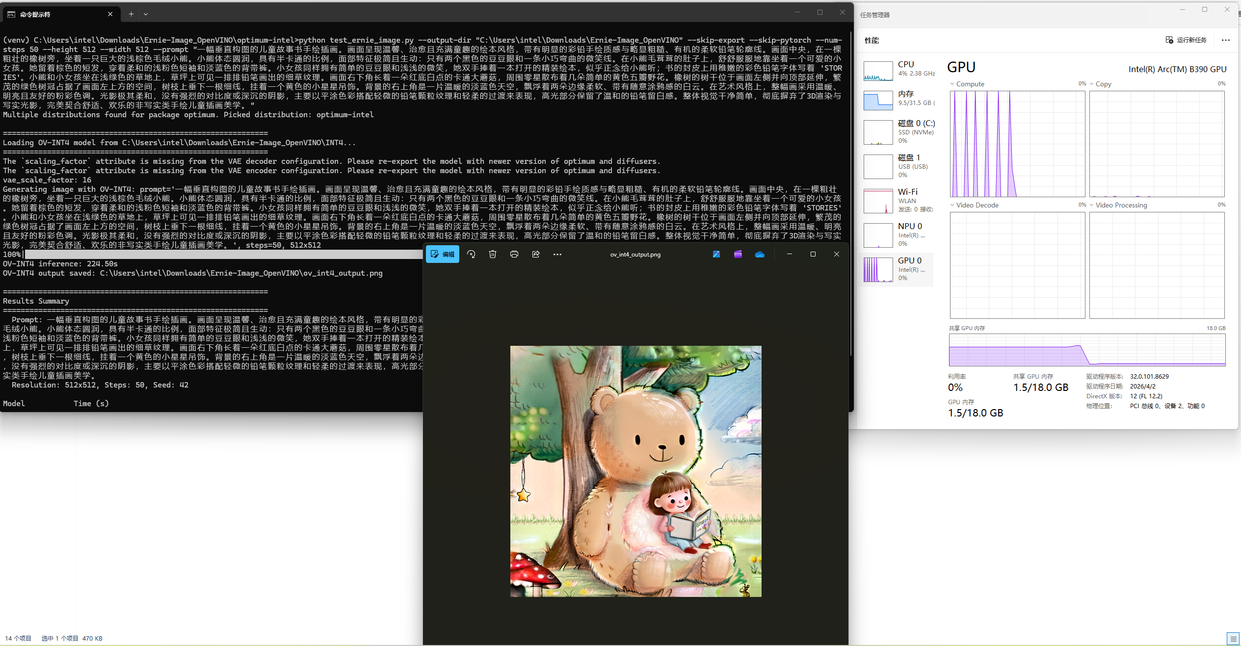 对 Intel 平台开发者来说,这次 OpenVINO™ 对 ERNIE-Image 的 Day 0 支持,意义不只是“多支持了一个新模型”,而是把一个具备复杂指令遵循、文字渲染、结构化生成和多风格表达能力的 8B 文生图模型,第一时间带到了可部署、可验证、可集成的状态。现在,开发者已经可以基于已验证的依赖组合,把原始 PyTorch 权重导出为 FP16 / INT8 / INT4 OpenVINO™ IR,并通过 OpenVINO™在 Intel CPU 和 GPU 路线上更快完成测试与应用验证。